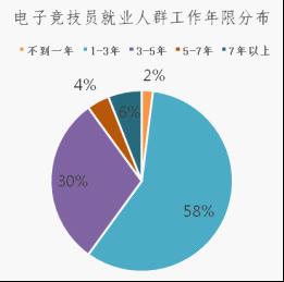 对电子竞技员就业人群从业年限情况进行调研,通过数据整理可以看出,其中有58%被调查的电竞从业人员工作年限在1-3年之间,30%的电竞从业人员工作年限是3-5年,这两项占据了被调查者总数量的88%,另外有7%的从业人员工作7年以上,4%的从业人员工作5-7年,2%的从业人员工作不到1年。根据调研结果可见,电竞行业从业者的工作年限都相对较短,这与整个电竞行业发展周期较短有必然联系。