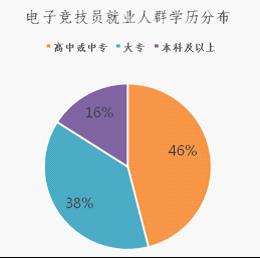 对电子竞技员就业人群学历情况进行调研,通过数据整理可以看出,被调查者的学历基本集中在高中或中专、大专、本科这3个层次,其中占比最大的高中或中专学历占被调查者总量的46%,其次是大专学历占38%,最后是本科及以上学历占16%。根据调查结果可见,电子竞技员学历相对要求不高,基本集中在大专、中专学历,电子竞技员就业门槛低。