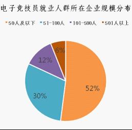 对电子竞技员就业人群所在企业规模进行调研,通过数据整理可以看出,50人及以下占比52%,51-100人占比30%,101-500人占比12%,501人及以上占比6%。电子竞技员所在企业以小、微型公司为主,这与当前就业企业以电子竞技俱乐部为主有很大的关系。
