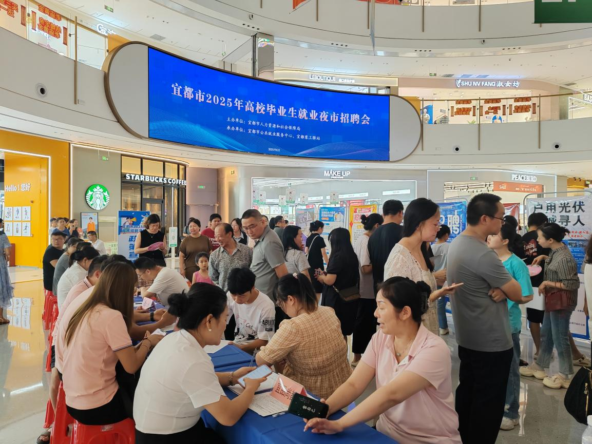 为积极促进高校毕业生等青年群体就业,8月7日晚,宜都市2025年首场高校毕业生夜市招聘会在宜都万达广场开场。