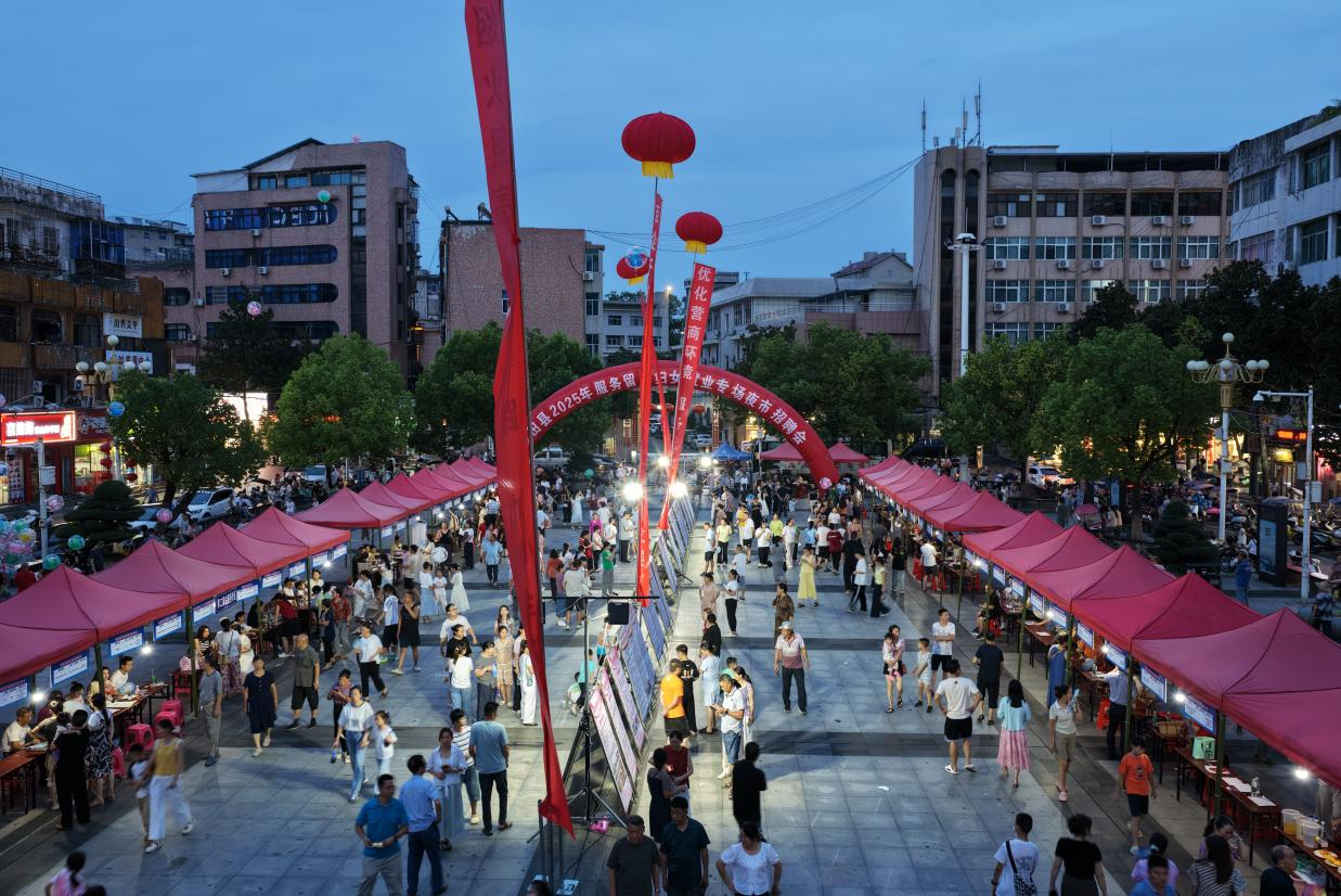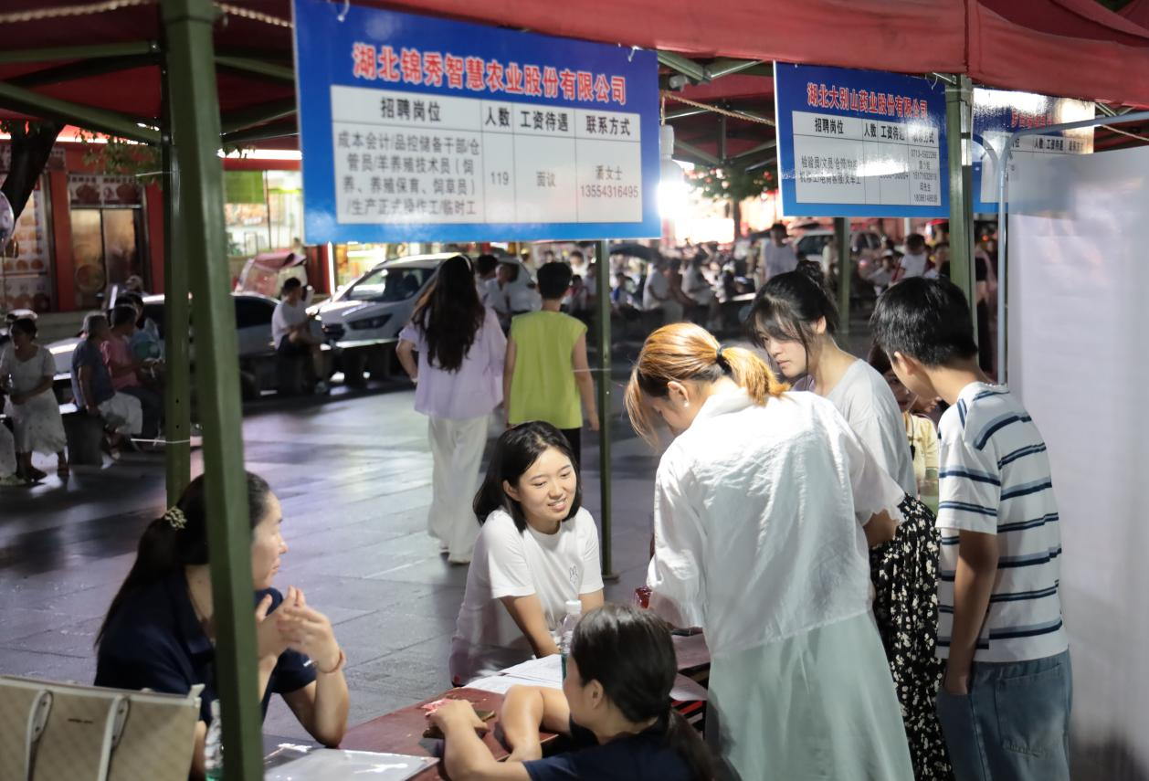 8月7日晚,罗田县人民广场灯火通明,“星光职约”留守妇女专场夜市招聘会在此举行。活动由县委社会工作部、县妇联、县人社局联合主办,吸引500余名群众参与,现场达成就业意向108人。