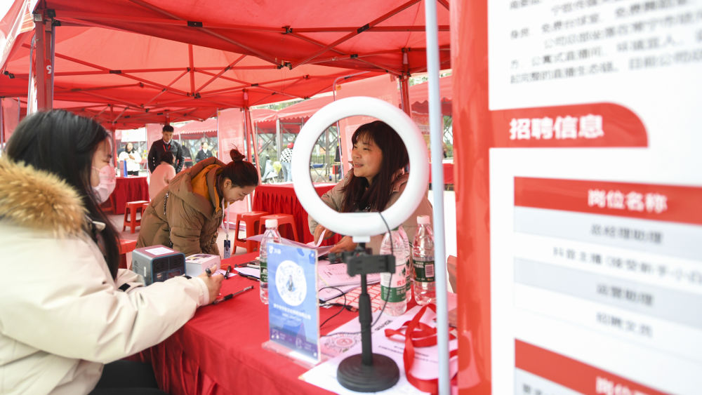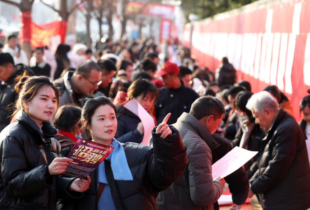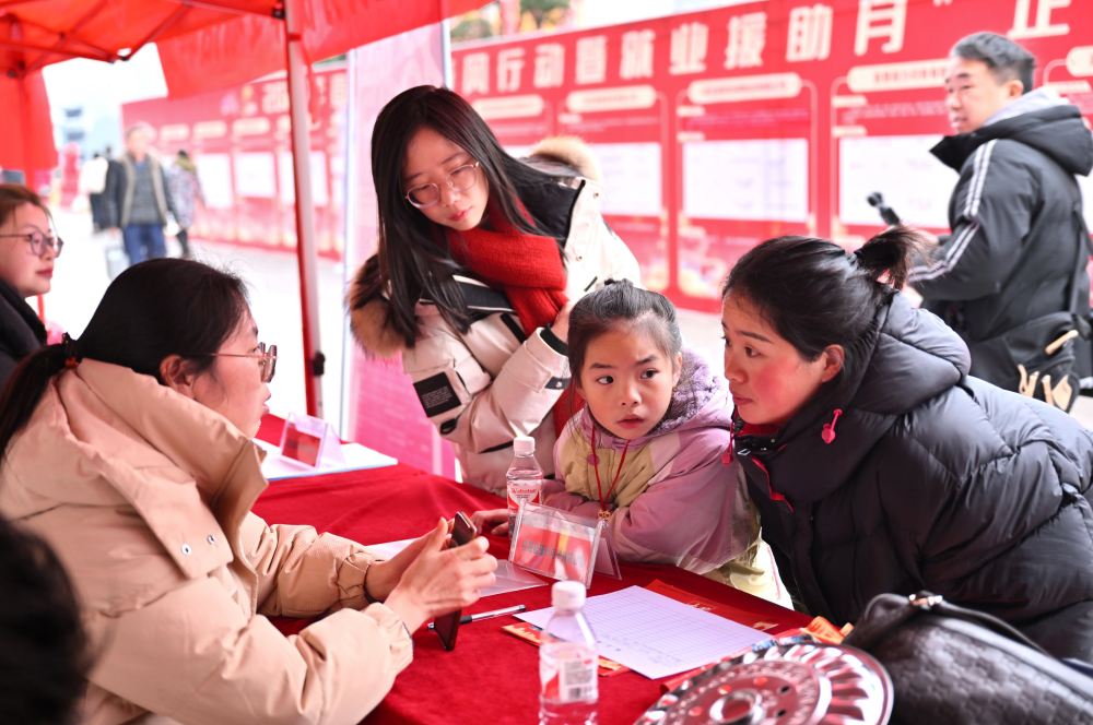↑1月22日,在湖南省永州市道县周敦颐文化广场,市民在招聘现场了解招聘信息。新华社发(蒋克青摄)