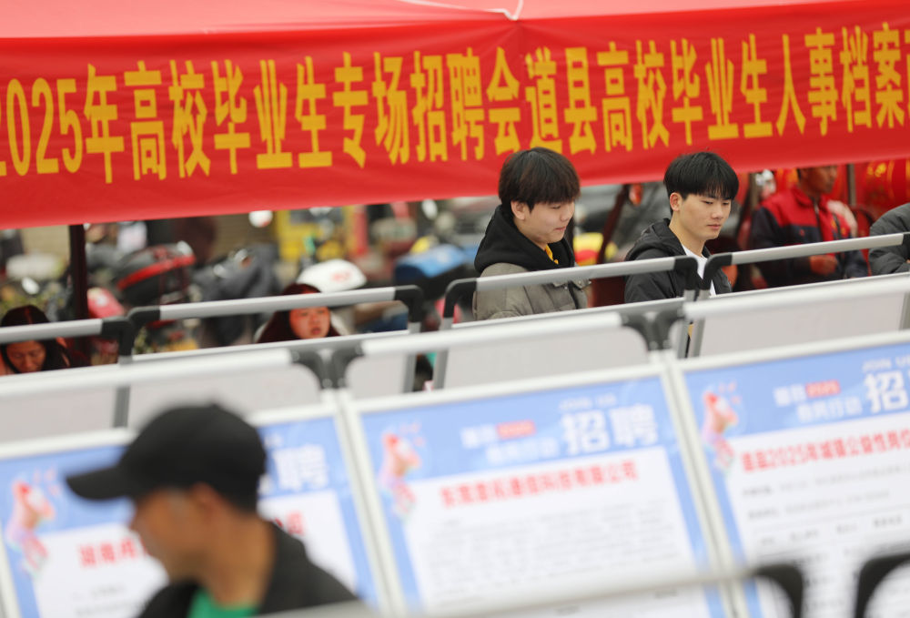 ↑1月22日,求职者在湖南省永州市道县大型招聘会上了解岗位信息。新华社发(何红福摄)