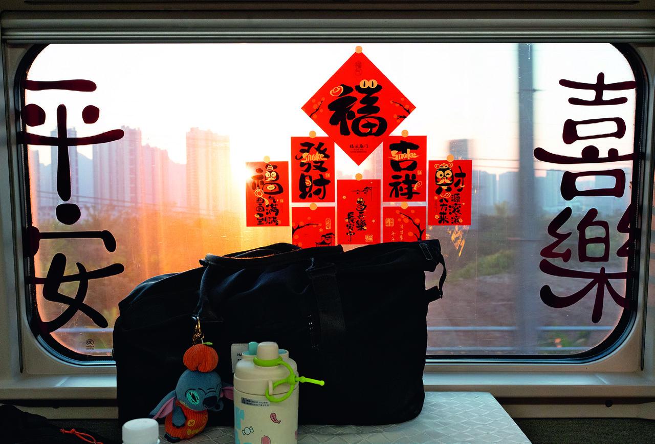 ▲返乡列车上,荆门市人社部门工作人员布置好车厢,充满温馨的节日氛围。(图/杨佳)
