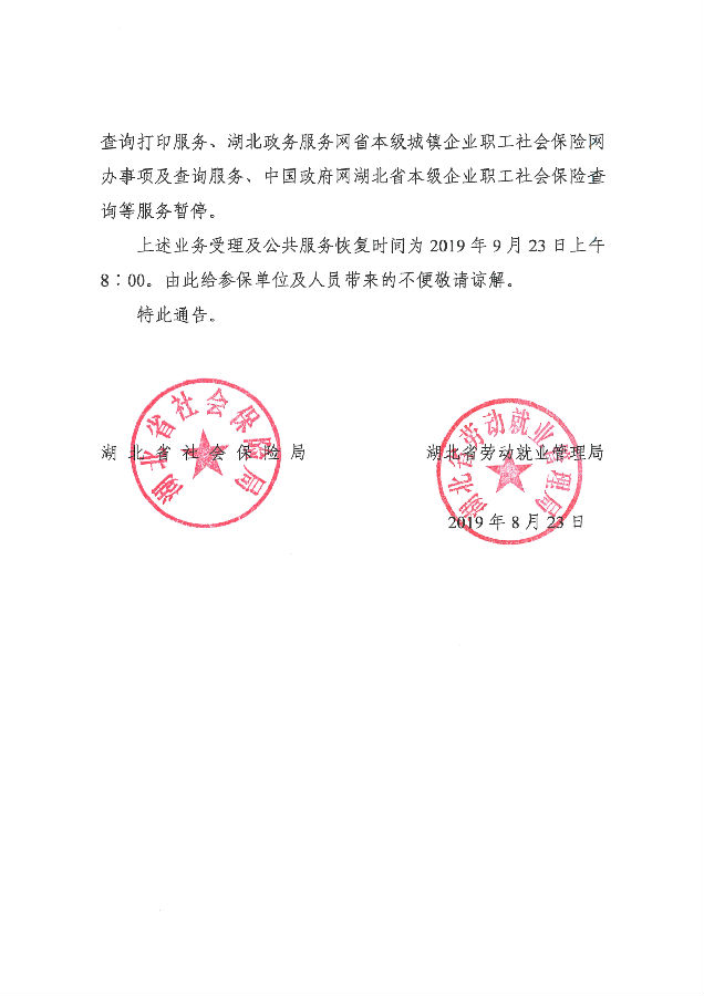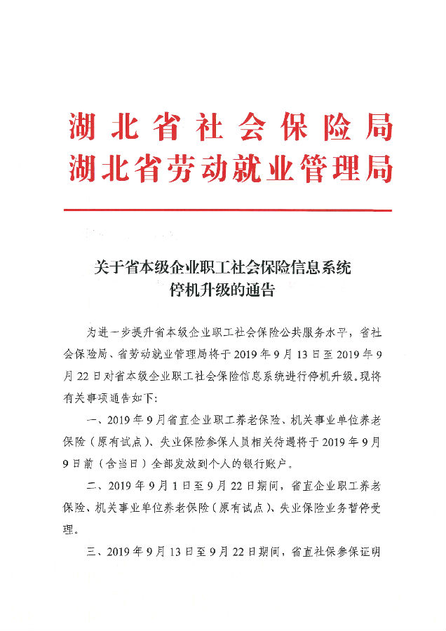 湖北省社会保险局、湖北省劳动就业管理局关于省本级企业职工社会保险信息系统停机升级的通告