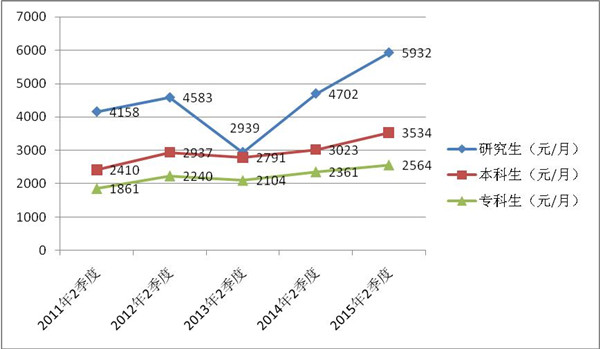 研究生起薪平均数为4727元/月,本科生为2995元/月,专科生为2317元/月,与去年二季度相比变化平稳。近5年同期情况如下表: